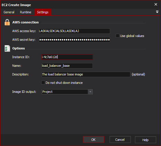 The Access Key and Secret Key for your AWS account. If "Use Global Values" is checked, the values set in the options page (Tools > Options > Internet > EC2) will be used instead.