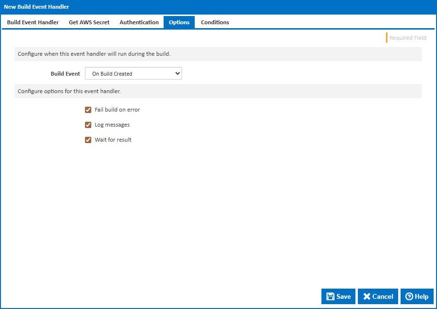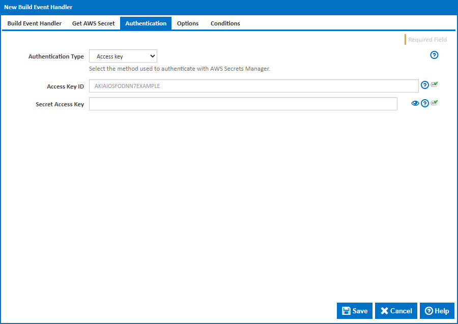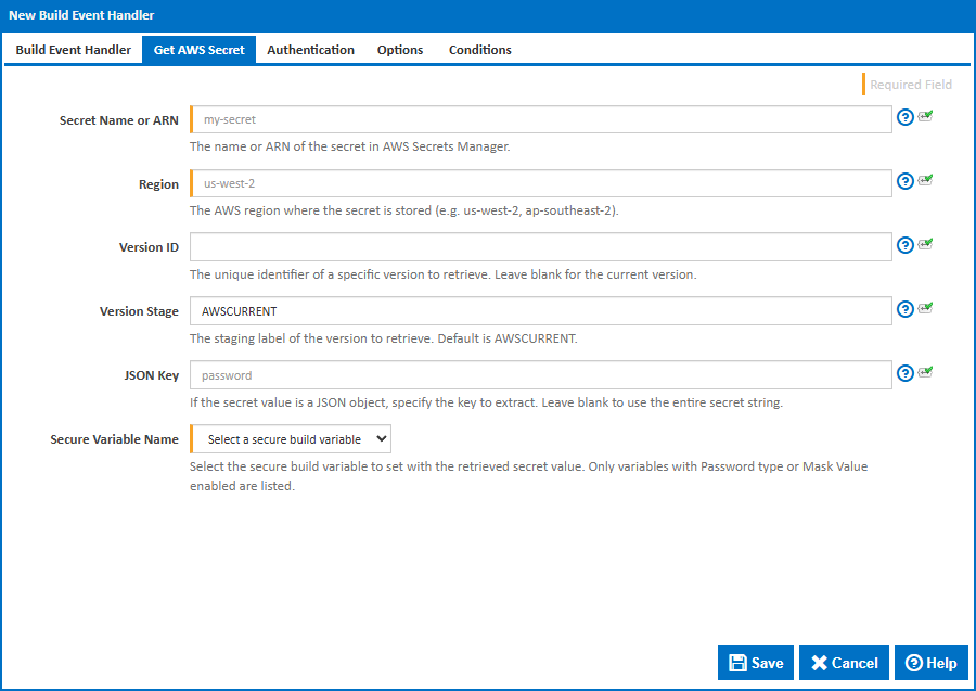 The Get AWS Secret build event handler retrieves a secret from AWS Secrets Manager and sets its value into a secure build variable. This allows builds to access secrets stored in AWS without exposing credentials in configuration files.
