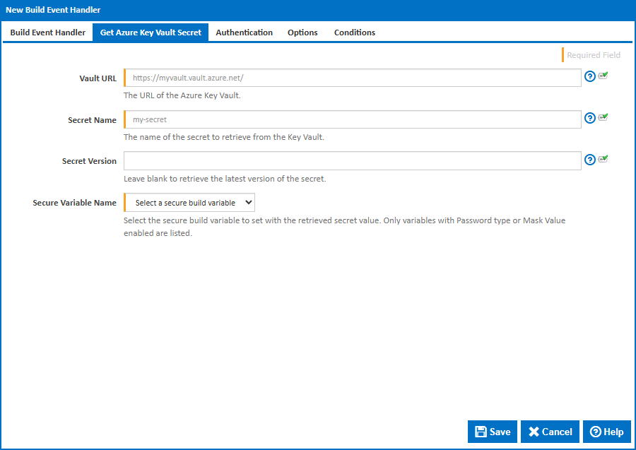 The Get Azure Key Vault Secret build event handler retrieves a secret from Azure Key Vault and sets its value into a secure build variable. This allows builds to access secrets stored in Azure without exposing them in configuration files or environment variables.