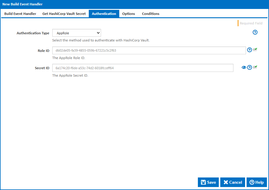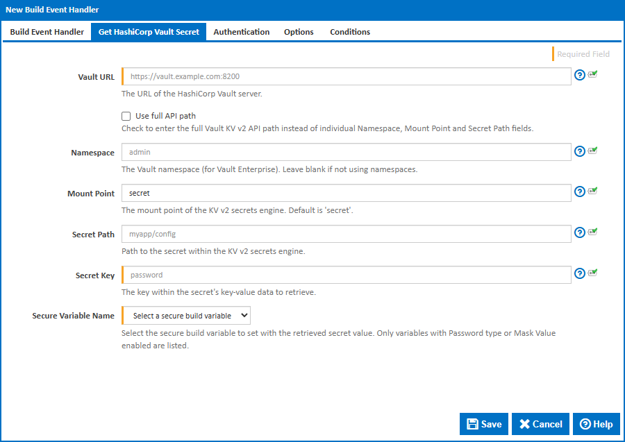 The Get HashiCorp Vault Secret build event handler retrieves a secret from a HashiCorp Vault KV v2 secrets engine and sets its value into a secure build variable. This allows builds to access secrets stored in Vault without exposing credentials in configuration files.