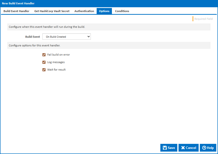 Specify when to retrieve the secret by selecting one of the available Build Events. The default is On Build Created, which retrieves the secret at the earliest point in the build lifecycle so it is available for all stages.