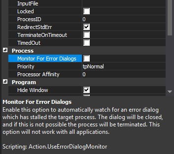 The ideal solution to this problem is to ask the author of the external program to rewrite the application so it does not display error dialogs during automatic execution. However, this is not always possible. In such situations, the Error Dialog Monitor feature may be of use.