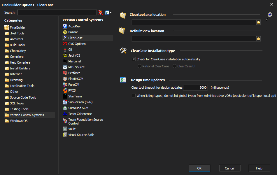 Cleartool.exe location & ClearCase Installation Type should be set automatically on a computer with a ClearCase installation, although they can be overridden manually if desired. ClearCase Installation Type enables and disables some options which are only available in ClearCase or ClearCase LT, respectively.