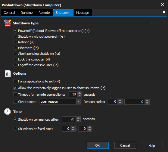 You can specify a delay (in seconds) before shutdown, or an absolute time (hours and minutes) at which to shutdown. Only applicable to those shutdown types marked (*) above.