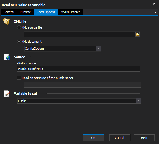 Read XML Value to Variable allows you retrieve a text or attribute value from an XML file and store it in a FinalBuilder variable.